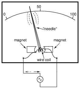 AC electromechanical meter movements come in two basic arrangements: those based on DC movement designs, and those engineered specifically for AC use. Permanent-magnet moving coil (PMMC) meter movements will not work correctly if directly connected to alternating current, because the direction of needle movement will change with each half-cycle of the AC. (Figure below) Permanent-magnet meter movements, like permanent-magnet motors, are devices whose motion depends on the polarity of the applied voltage (or, you can think of it in terms of the direction of the current).