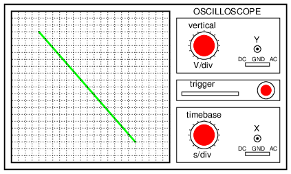If the two frequencies are the same, we will obtain a simple figure on the screen of the CRT, the shape of that figure being dependent upon the phase shift between the two AC signals. Here is a sampling of Lissajous figures for two sine-wave signals of equal frequency, shown as they would appear on the face of an oscilloscope (an AC voltage-measuring instrument using a CRT as its “movement”). The first picture is of the Lissajous figure formed by two AC voltages perfectly in phase with each other: (Figure below)