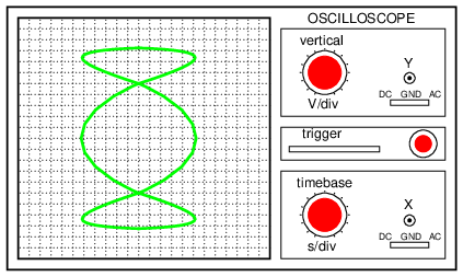 In cases where the frequencies of the two AC signals are not exactly a simple ratio of each other (but close), the Lissajous figure will appear to “move,” slowly changing orientation as the phase angle between the two waveforms rolls between 0o and 180o. If the two frequencies are locked in an exact integer ratio between each other, the Lissajous figure will be stable on the viewscreen of the CRT.