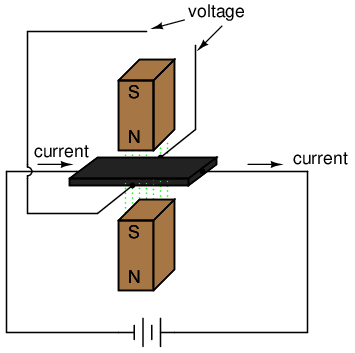 Hall effect: Voltage is proportional to current and strength of the perpendicular magnetic field.