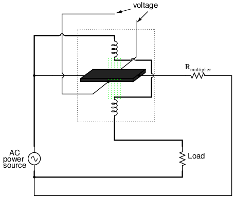 It makes sense then that if we were to build a device using a Hall-effect sensor where the current through the conductor was pushed by AC voltage from an external circuit and the magnetic field was set up by a pair or wire coils energized by the current of the AC power circuit, the Hall voltage would be in direct proportion to the multiple of circuit current and voltage. Having no mass to move (unlike an electromechanical movement), this device is able to provide instantaneous power measurement: (Figure below)
