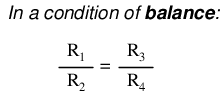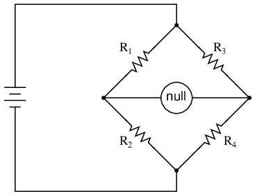 Any one of the four resistors in the above bridge can be the resistor of unknown value, and its value can be determined by a ratio of the other three, which are “calibrated,” or whose resistances are known to a precise degree. When the bridge is in a balanced condition (zero voltage as indicated by the null detector), the ratio works out to be this: