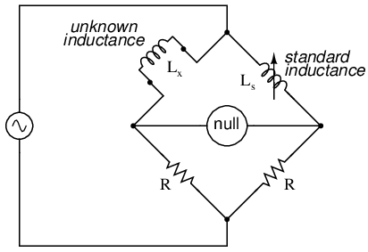 A couple of simple bridge circuits are shown below, one for inductance (Figure below) and one for capacitance: (Figure below)