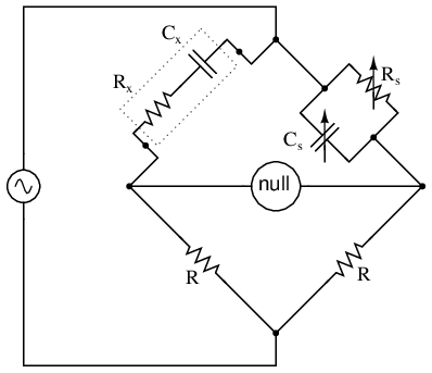An example of a little extra complexity added to compensate for real-world effects can be found in the so-called Wien bridge, which uses a parallel capacitor-resistor standard impedance to balance out an unknown series capacitor-resistor combination. (Figure below) All capacitors have some amount of internal resistance, be it literal or equivalent (in the form of dielectric heating losses) which tend to spoil their otherwise perfectly reactive natures. This internal resistance may be of interest to measure, and so the Wien bridge attempts to do so by providing a balancing impedance that isn't “pure” either: