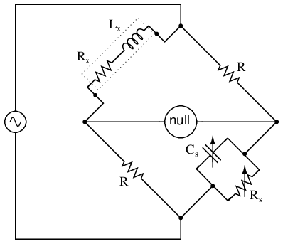 Bridge circuits can be constructed to measure just about any device value desired, be it capacitance, inductance, resistance, or even “Q.” As always in bridge measurement circuits, the unknown quantity is always “balanced” against a known standard, obtained from a high-quality, calibrated component that can be adjusted in value until the null detector device indicates a condition of balance. Depending on how the bridge is set up, the unknown component's value may be determined directly from the setting of the calibrated standard, or derived from that standard through a mathematical formula.