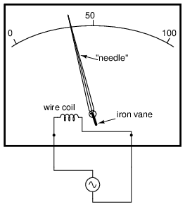 Another strategy for a practical AC meter movement is to redesign the movement without the inherent polarity sensitivity of the DC types. This means avoiding the use of permanent magnets. Probably the simplest design is to use a nonmagnetized iron vane to move the needle against spring tension, the vane being attracted toward a stationary coil of wire energized by the AC quantity to be measured as in Figure below.