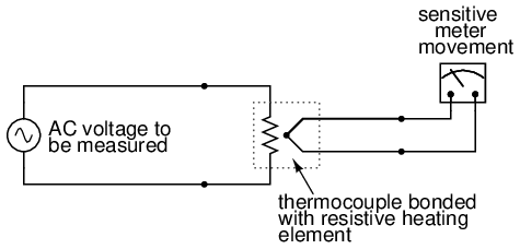 While the device shown above is somewhat crude and would suffer from unique engineering problems of its own, the concept illustrated is very sound. The resistor converts the AC voltage or current quantity into a thermal (heat) quantity, effectively squaring the values in real-time. The system's mass works to average these values by the principle of thermal inertia, and then the meter scale itself is calibrated to give an indication based on the square-root of the thermal measurement: perfect Root-Mean-Square indication all in one device! In fact, one major instrument manufacturer has implemented this technique into its high-end line of handheld electronic multimeters for “true-RMS” capability.
