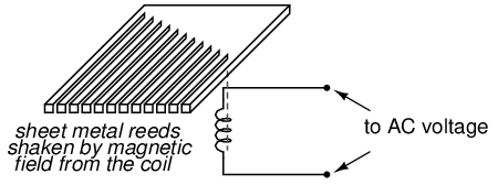 Imagine a row of progressively-sized tuning forks arranged side-by-side. They are all mounted on a common base, and that base is vibrated at the frequency of the measured AC voltage (or current) by means of an electromagnet. Whichever tuning fork is closest in resonant frequency to the frequency of that vibration will tend to shake the most (or the loudest). If the forks' tines were flimsy enough, we could see the relative motion of each by the length of the blur we would see as we inspected each one from an end-view perspective. Well, make a collection of “tuning forks” out of a strip of sheet metal cut in a pattern akin to a rake, and you have the vibrating reed frequency meter: (Figure below)