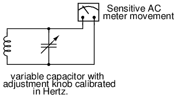 While reed-type meters are imprecise, their operational principle is not. In lieu of mechanical resonance, we may substitute electrical resonance and design a frequency meter using an inductor and capacitor in the form of a tank circuit (parallel inductor and capacitor). See Figure below. One or both components are made adjustable, and a meter is placed in the circuit to indicate maximum amplitude of voltage across the two components. The adjustment knob(s) are calibrated to show resonant frequency for any given setting, and the frequency is read from them after the device has been adjusted for maximum indication on the meter. Essentially, this is a tunable filter circuit which is adjusted and then read in a manner similar to a bridge circuit (which must be balanced for a “null” condition and then read).