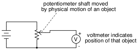 It is often necessary to be able to detect and transmit the physical position of mechanical parts via electrical signals. This is especially true in the fields of automated machine tool control and robotics. A simple and easy way to do this is with a potentiometer: (Figure below)