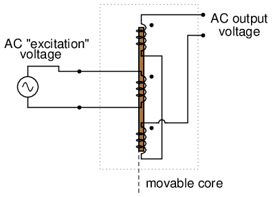 Obviously, this device is a transformer: it has a single primary winding powered by an external source of AC voltage, and two secondary windings connected in series-bucking fashion. It is variable because the core is free to move between the windings. It is differential because of the way the two secondary windings are connected. Being arranged to oppose each other (180o out of phase) means that the output of this device will be the difference between the voltage output of the two secondary windings. When the core is centered and both windings are outputting the same voltage, the net result at the output terminals will be zero volts. It is called linear because the core's freedom of motion is straight-line.