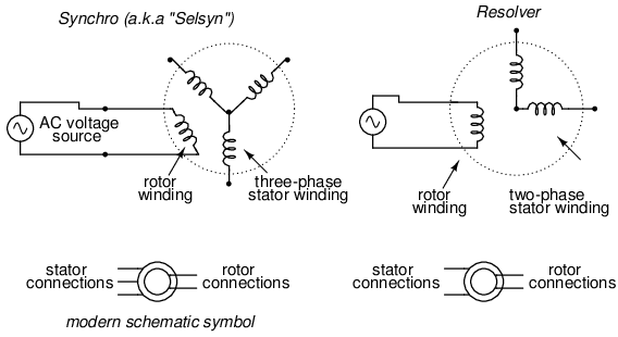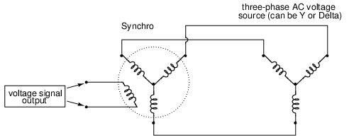Continuing with this principle, we have what is known as a Synchro or Selsyn, which is a device constructed a lot like a wound-rotor polyphase AC motor or generator. The rotor is free to revolve a full 360o, just like a motor. On the rotor is a single winding connected to a source of AC voltage, much like the primary winding of an LVDT. The stator windings are usually in the form of a three-phase Y, although synchros with more than three phases have been built. (Figure below) A device with a two-phase stator is known as a resolver. A resolver produces sine and cosine outputs which indicate shaft position.