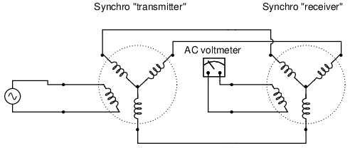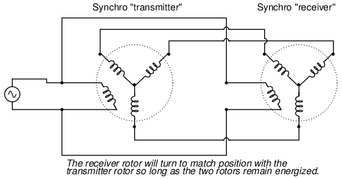 Synchros are often used in pairs. With their rotors connected in parallel and energized by the same AC voltage source, their shafts will match position to a high degree of accuracy: (Figure below)