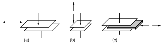 Like inductive transducers, capacitive transducers can also be made to be self-contained units, unlike the direct physiological examples described above. Some transducers work by making one of the capacitor plates movable, either in such a way as to vary the overlapping area or the distance between the plates. Other transducers work by moving a dielectric material in and out between two fixed plates: (Figure below)