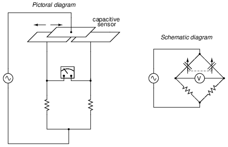 As you can see, all of the differential devices shown in the above illustration have three wire connections rather than two: one wire for each of the “end” plates and one for the “common” plate. As the capacitance between one of the “end” plates and the “common” plate changes, the capacitance between the other “end” plate and the “common” plate is such to change in the opposite direction. This kind of transducer lends itself very well to implementation in a bridge circuit: (Figure below)