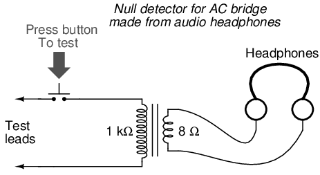 One way to maximize the effectiveness of audio headphones as a null detector is to connect them to the signal source through an impedance-matching transformer. Headphone speakers are typically low-impedance units (8 Ω), requiring substantial current to drive, and so a step-down transformer helps “match” low-current signals to the impedance of the headphone speakers. An audio output transformer works well for this purpose: (Figure below)