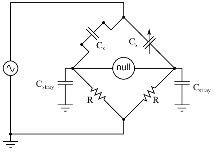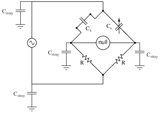 A potential problem in sensitive AC bridge circuits is that of stray capacitance between either end of the null detector unit and ground (earth) potential. Because capacitances can “conduct” alternating current by charging and discharging, they form stray current paths to the AC voltage source which may affect bridge balance: (Figure below)