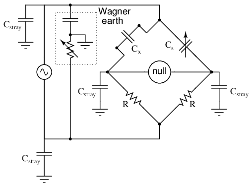 One way of greatly reducing this effect is to keep the null detector at ground potential, so there will be no AC voltage between it and the ground, and thus no current through stray capacitances. However, directly connecting the null detector to ground is not an option, as it would create a direct current path for stray currents, which would be worse than any capacitive path. Instead, a special voltage divider circuit called a Wagner ground or Wagner earth may be used to maintain the null detector at ground potential without the need for a direct connection to the null detector. (Figure below)