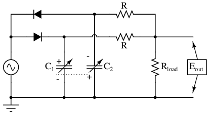 Capacitor C1 is charged by the AC voltage source during every positive half-cycle (positive as measured in reference to the ground point), while C2 is charged during every negative half-cycle. While one capacitor is being charged, the other capacitor discharges (at a slower rate than it was charged) through the three-resistor network. As a consequence, C1 maintains a positive DC voltage with respect to ground, and C2 a negative DC voltage with respect to ground.