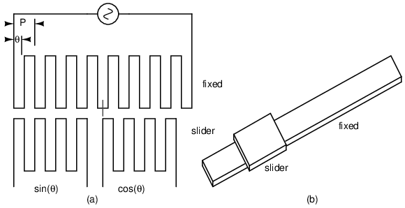 Inductosyn: (a) Fixed serpentine winding, (b) movable slider 2-phase windings. Adapted from Figure 6.16 [WAK]