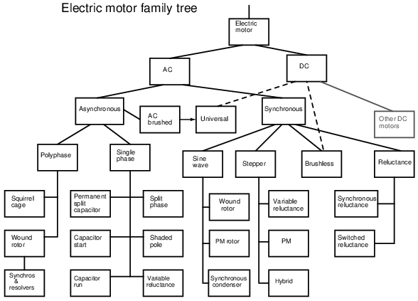 Modern solid state electronic circuits drive brushless DC motors with AC waveforms generated from a DC source. The brushless DC motor, actually an AC motor, is replacing the conventional brushed DC motor in many applications. And, the stepper motor, a digital version of motor, is driven by alternating current square waves, again, generated by solid state circuitry Figure above shows the family tree of the AC motors described in this chapter.