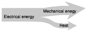 At the system level, (Figure above) a motor takes in electrical energy in terms of a potential difference and a current flow, converting it to mechanical work. Alas, electric motors are not 100% efficient. Some of the electric energy is lost to heat, another form of energy, due to I2R losses in the motor windings. The heat is an undesired byproduct of the conversion. It must be removed from the motor and may adversely affect longevity. Thus, one goal is to maximize motor efficiency, reducing the heat loss. AC motors also have some losses not encountered by DC motors: hysteresis and eddy currents.