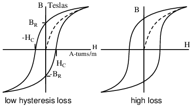 If the laminations are made of silicon alloy grain oriented steel, hysteresis losses are minimized. Magnetic hysteresis is a lagging behind of magnetic field strength as compared to magnetizing force. If a soft iron nail is temporarily magnetized by a solenoid, one would expect the nail to lose the magnetic field once the solenoid is de-energized. However, a small amount of residual magnetization, Br due to hysteresis remains. (Figure below) An alternating current has to expend energy, -Hc the coercive force, in overcoming this residual magnetization before it can magnetize the core back to zero, let alone in the opposite direction. Hysteresis loss is encountered each time the polarity of the AC reverses. The loss is proportional to the area enclosed by the hysteresis loop on the B-H curve. “Soft” iron alloys have lower losses than “hard” high carbon steel alloys. Silicon grain oriented steel, 4% silicon, rolled to preferentially orient the grain or crystalline structure, has still lower losses.