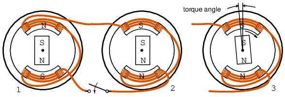 If more torque in the direction of rotation is applied to the rotor of one of the above rotating alternators, the angle of the rotor will advance (opposite of (3)) with respect to the magnetic field in the stator coils while still synchronized and the rotor will deliver energy to the AC line like an alternator. The rotor will also be advanced with respect to the rotor in the other alternator. If a load such as a brake is applied to one of the above units, the angle of the rotor will lag the stator field as at (3), extracting energy from the AC line, like a motor. If excessive torque or drag is applied, the rotor will exceed the maximum torque angle advancing or lagging so much that synchronization is lost. Torque is developed only when synchronization of the motor is maintained.