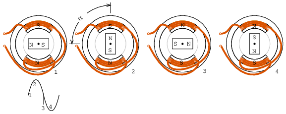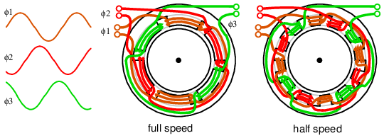 The 3-phase 4-pole (per phase) synchronous motor (Figure below) will rotate at 1800 rpm with 60 Hz power or 1500 rpm with 50 Hz power. If the coils are energized one at a time in the sequence φ-1, φ-2, φ-3, the rotor should point to the corresponding poles in turn. Since the sine waves actually overlap, the resultant field will rotate, not in steps, but smoothly. For example, when the φ-1 and φ-2 sinewaves coincide, the field will be at a peak pointing between these poles. The bar magnet rotor shown is only appropriate for small motors. The rotor with multiple magnet poles (below right) is used in any efficient motor driving a substantial load. These will be slip ring fed electromagnets in large industrial motors. Large industrial synchronous motors are self started by embedded squirrel cage conductors in the armature, acting like an induction motor. The electromagnetic armature is only energized after the rotor is brought up to near synchronous speed.