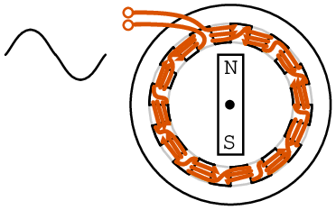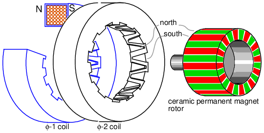 Small multi-phase synchronous motors (Figure above) may be started by ramping the drive frequency from zero to the final running frequency. The multi-phase drive signals are generated by electronic circuits, and will be square waves in all but the most demanding applications. Such motors are known as brushless DC motors. True synchronous motors are driven by sine waveforms. Two or three phase drive may be used by supplying the appropriate number of windings in the stator. Only 3-phase is shown above.