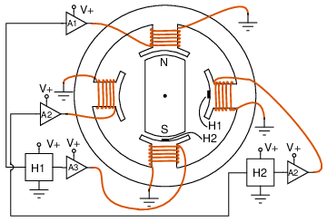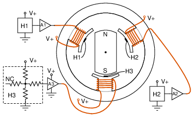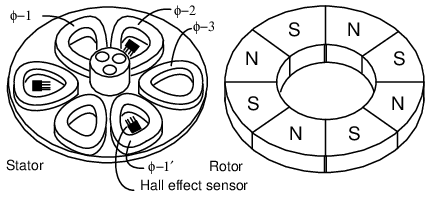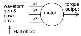 A motor driven by square waves of current, as provided by simple Hall effect sensors, is known as a brushless DC motor. This type of motor has higher ripple torque torque variation through a shaft revolution than a sine wave driven motor. This is not a problem for many applications. Though, we are primarily interested in synchronous motors in this section.