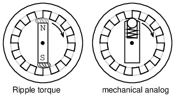Ripple torque, or cogging is caused by magnetic attraction of the rotor poles to the stator pole pieces. (Figure above) Note that there are no stator coils, not even a motor. The PM rotor may be rotated by hand but will encounter attraction to the pole pieces when near them. This is analogous to the mechanical situation. Would ripple torque be a problem for a motor used in a tape player? Yes, we do not want the motor to alternately speed and slow as it moves audio tape past a tape playback head. Would ripple torque be a problem for a fan motor? No.