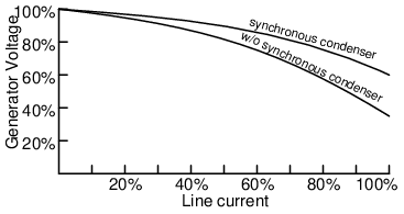 The efficiency of long power transmission lines may be increased by placing synchronous condensers along the line to compensate lagging currents caused by line inductance. More real power may be transmitted through a fixed size line if the power factor is brought closer to unity by synchronous condensers absorbing reactive power.