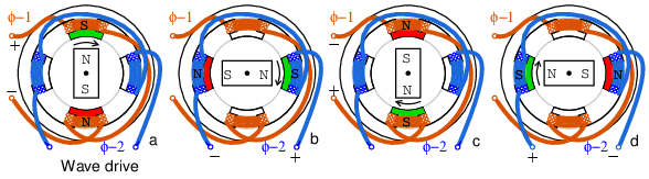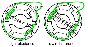 Sequential switching (Figure below) of the stator phases moves the rotor from one position to the next. The mangetic flux seeks the path of least reluctance, the magnetic analog of electric resistance. This is an over simplified rotor and waveforms to illustrate operation.