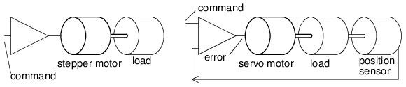 Application wise, the predecessor of the stepper motor was the servo motor. Today this is a higher cost solution to high performance motion control applications. The expense and complexity of a servomotor is due to the additional system components: position sensor and error amplifier. (Figure below) It is still the way to position heavy loads beyond the grasp of lower power steppers. High acceleration or unusually high accuracy still requires a servo motor. Otherwise, the default is the stepper due to low cost, simple drive electronics, good accuracy, good torque, moderate speed, and low cost.
