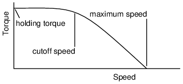 Since stepper motors do not necessarily rotate continuously, there is no horsepower rating. If they do rotate continuously, they do not even approach a sub-fractional hp rated capability. They are truly small low power devices compared to other motors. They have torque ratings to a thousand in-oz (inch-ounces) or ten n-m (newton-meters) for a 4 kg size unit. A small “dime” size stepper has a torque of a hundredth of a newton-meter or a few inch-ounces. Most steppers are a few inches in diameter with a fraction of a n-m or a few in-oz torque. The torque available is a function of motor speed, load inertia, load torque, and drive electronics as illustrated on the speed vs torque curve. (Figure below) An energized, holding stepper has a relatively high holding torque rating. There is less torque available for a running motor, decreasing to zero at some high speed. This speed is frequently not attainable due to mechanical resonance of the motor load combination.