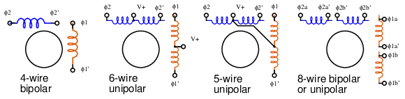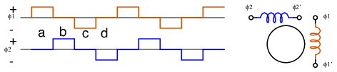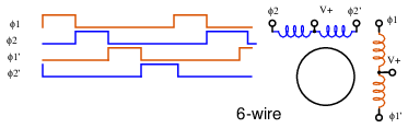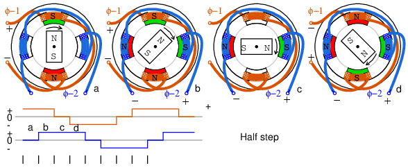 The drive waveforms for the 3-φ stepper can be seen in the “Reluctance motor” section. The drive for a 4-φ stepper is shown in Figure below. Sequentially switching the stator phases produces a rotating magnetic field which the rotor follows. However, due to the lesser number of rotor poles, the rotor moves less than the stator angle for each step. For a variable reluctance stepper motor, the step angle is given by: