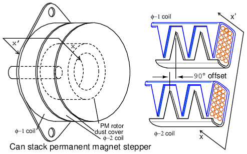 Stepper motors are rugged and inexpensive because the rotor contains no winding slip rings, or commutator. The rotor is a cylindrical solid, which may also have either salient poles or fine teeth. More often than not the rotor is a permanent magnet. Determine that the rotor is a permanent magnet by unpowered hand rotation showing detent torque, torque pulsations. Stepper motor coils are wound within a laminated stator, except for can stack construction. There may be as few as two winding phases or as many as five. These phases are frequently split into pairs. Thus, a 4-pole stepper motor may have two phases composed of in-line pairs of poles spaced 90o apart. There may also be multiple pole pairs per phase. For example a 12-pole stepper has 6-pairs of poles, three pairs per phase.