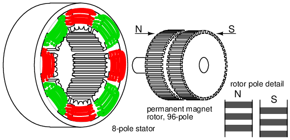A variable reluctance stepper motor relies upon magnetic flux seeking the lowest reluctance path through a magnetic circuit. This means that an irregularly shaped soft magnetic rotor will move to complete a magnetic circuit, minimizing the length of any high reluctance air gap. The stator typically has three windings distributed between pole pairs , the rotor four salient poles, yielding a 30o step angle.(Figure below) A de-energized stepper with no detent torque when hand rotated is identifiable as a variable reluctance type stepper.