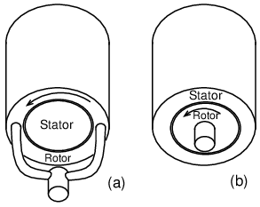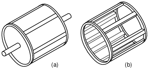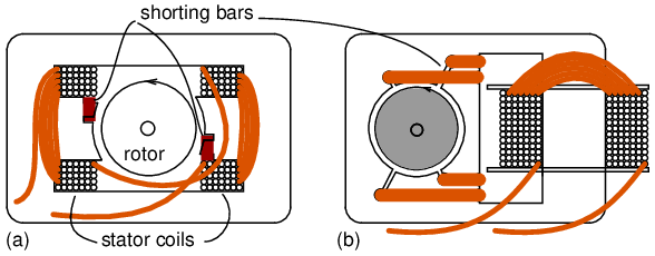 Shaded pole induction motor, (a) dual coil design, (b) smaller single coil version.