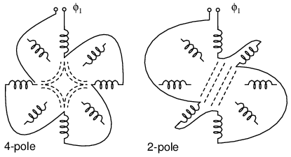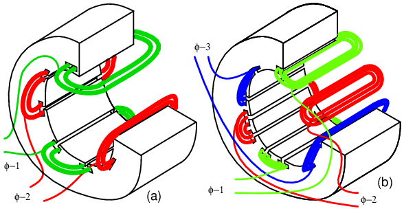 Single phase induction motors may have coils embedded into the stator as shown in Figure above for larger size motors. Though, the smaller sizes use less complex to build concentrated windings with salient poles.
