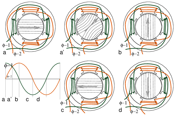 One way to solve the single phase problem is to build a 2-phase motor, deriving 2-phase power from single phase. This requires a motor with two windings spaced apart 90o electrical, fed with two phases of current displaced 90o in time. This is called a permanent-split capacitor motor in Figure below.