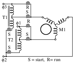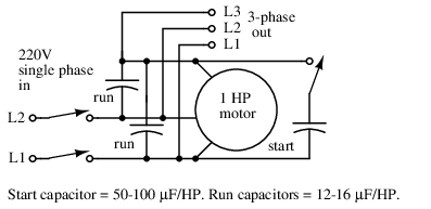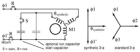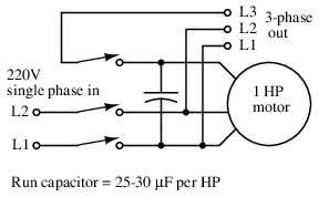 A three phase motor may be run from a single phase power source. (Figure below) However, it will not self-start. It may be hand started in either direction, coming up to speed in a few seconds. It will only develop 2/3 of the 3-φ power rating because one winding is not used.