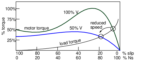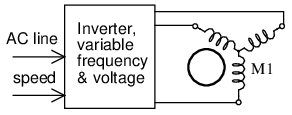 The variable speed drive must also reduce the drive voltage at low speed due to decreased inductive reactance at lower frequency. To develop maximum torque, the rotor needs to lag the stator field direction by 90o. Any more, it loses synchronization. Much less results in reduced torque. Thus, the position of the rotor needs to be known accurately. And the position of the rotor with respect to the stator field needs to be calculated, and controlled. This type of control is known as vector phase control. It is implemented with a fast microprocessor driving a pulse width modulator for the stator phases.