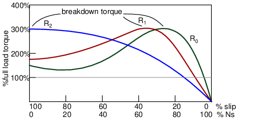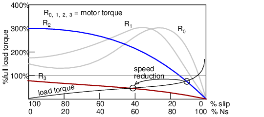 Motor speed may be varied by putting variable resistance back into the rotor circuit. This reduces rotor current and speed. The high starting torque available at zero speed, the down shifted break down torque, is not available at high speed. See R2 curve at 90% Ns, Figure below. Resistors R0R1R2R3 increase in value from zero. A higher resistance at R3 reduces the speed further. Speed regulation is poor with respect to changing torque loads. This speed control technique is only useful over a range of 50% to 100% of full speed. Speed control works well with variable speed loads like elevators and printing presses.