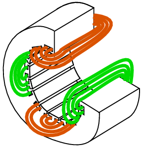 If a motor is driven by sinewaves of current synchronous with the motor back emf, it is classified as a synchronous AC motor, regardless of whether the drive waveforms are generated by electronic means. A synchronous motor will generate a sinusoidal back emf if the stator magnetic field has a sinusoidal distribution. It will be more sinusoidal if pole windings are distributed in a belt (Figure above) across many slots instead of concentrated on one large pole (as drawn in most of our simplified illustrations). This arrangement cancels many of the stator field odd harmonics. Slots having fewer windings at the edge of the phase winding may share the space with other phases. Winding belts may take on an alternate concentric form as shown in Figure below.