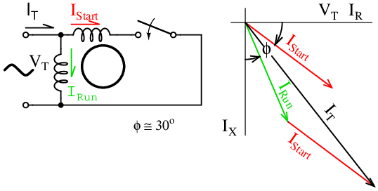 If an auxiliary winding of much fewer turns of smaller wire is placed at 90o electrical to the main winding, it can start a single phase induction motor. (Figure below) With lower inductance and higher resistance, the current will experience less phase shift than the main winding. About 30o of phase difference may be obtained. This coil produces a moderate starting torque, which is disconnected by a centrifugal switch at 3/4 of synchronous speed. This simple (no capacitor) arrangement serves well for motors up to 1/3 horsepower (250 watts) driving easily started loads.