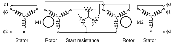 Normally, the rotor windings of a wound rotor induction motor are shorted out after starting. During starting, resistance may be placed in series with the rotor windings to limit starting current. If these windings are connected to a common starting resistance, the two rotors will remain synchronized during starting. (Figure below) This is useful for printing presses and draw bridges, where two motors need to be synchronized during starting. Once started, and the rotors are shorted, the synchronizing torque is absent. The higher the resistance during starting, the higher the synchronizing torque for a pair of motors. If the starting resistors are removed, but the rotors still paralleled, there is no starting torque. However there is a substantial synchronizing torque. This is a selsyn, which is an abbreviation for “self synchronous”.