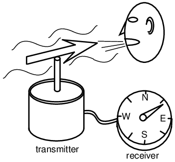 Remote position sensing is the main synchro application. (Figure below) For example, a synchro transmitter coupled to a radar antenna indicates antenna position on an indicator in a control room. A synchro transmitter coupled to a weather vane indicates wind direction at a remote console. Synchros are available for use with 240 Vac 50 Hz, 115 Vac 60 Hz, 115 Vac 400 Hz, and 26 Vac 400 Hz power.