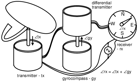 A shipboard radar antenna coupled to a synchro transmitter encodes the antenna angle with respect to ship's bow. (Figure below) It is desired to display the antenna position with respect to true north. We need to add the ships heading from a gyrocompass to the bow-relative antenna position to display antenna angle with respect to true north. ∠antenna + ∠gyro